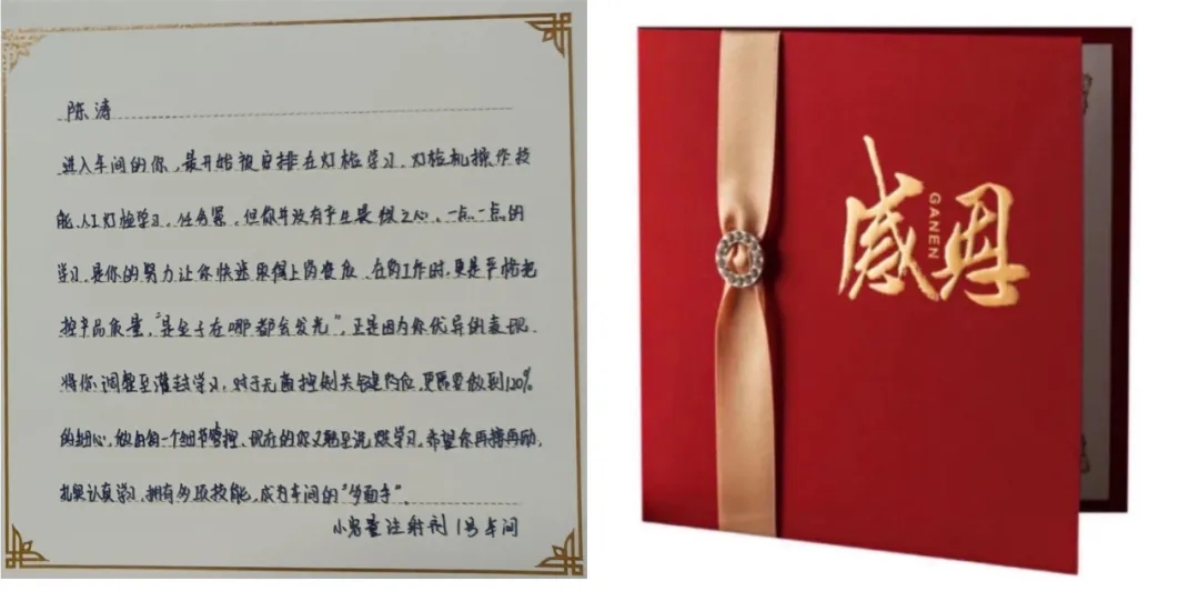 感謝卡:進(jìn)入車間的你,最開始被安排在燈檢學(xué)習(xí),燈檢機(jī)操作技能、人工燈檢學(xué)習(xí),任務(wù)緊,但你并沒有產(chǎn)生畏懼之心,一點(diǎn)一點(diǎn)的學(xué)習(xí)。是你的努力讓你快速取得上崗資質(zhì)。在崗工作時,更是嚴(yán)格把控產(chǎn)品質(zhì)量?!笆墙鹱釉谀亩紩l(fā)光”,正是因為你優(yōu)異的表現(xiàn),將你調(diào)整至灌封學(xué)習(xí),對于無菌控制關(guān)鍵崗位,更需要做到120%的細(xì)心,做好每一個細(xì)節(jié)管控。現(xiàn)在的你又轉(zhuǎn)至洗烘學(xué)習(xí),希望你再接再勵,扎實(shí)認(rèn)真學(xué)習(xí),擁有多項技能,成為車間“多面手”。