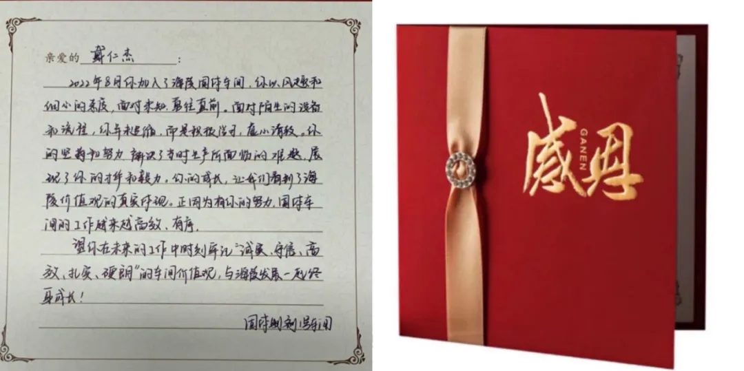 海陵衷心對(duì)他們的付出表示感謝,并為其準(zhǔn)備了感恩卡和禮物,直屬領(lǐng)導(dǎo)“驚喜出現(xiàn)”,將手寫感謝卡和禮物交給他們!