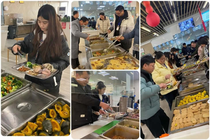 菜名吉利、美味豐盛的各色美食次序排開。大家一時(shí)難以抉擇,紛紛表示“我全都要”。餐盤中,海鮮肉食、清爽鮮蔬、精美糕點(diǎn)、甜蜜水果很快摞起一座高高的小山?!靶虏松峡 彼緞?wù)長(zhǎng)一聲吆喝,又引得無數(shù)圍觀,好不熱鬧。